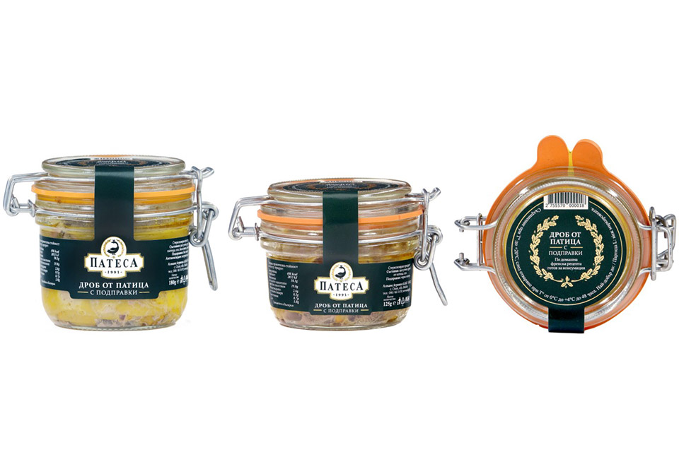 Пастет от дроб от патица, овкусен с порто, арманяк, захар, сол и бял пипер.
