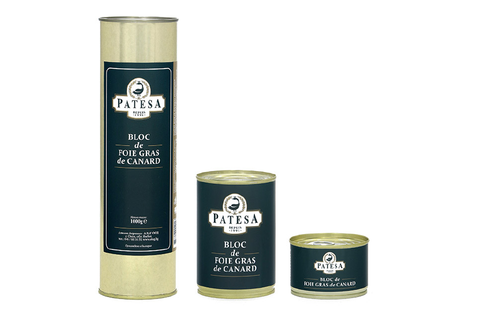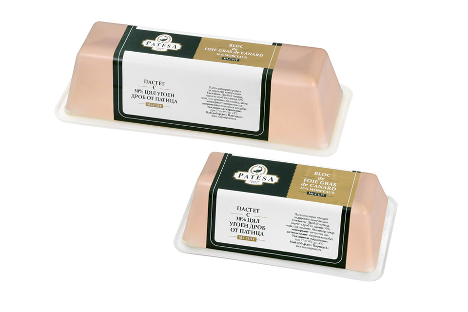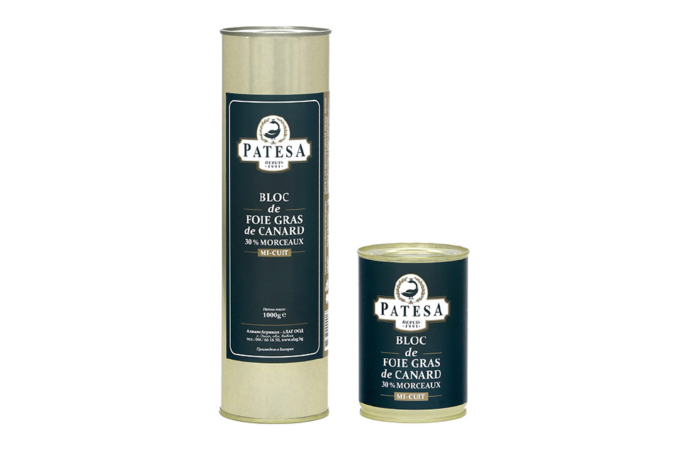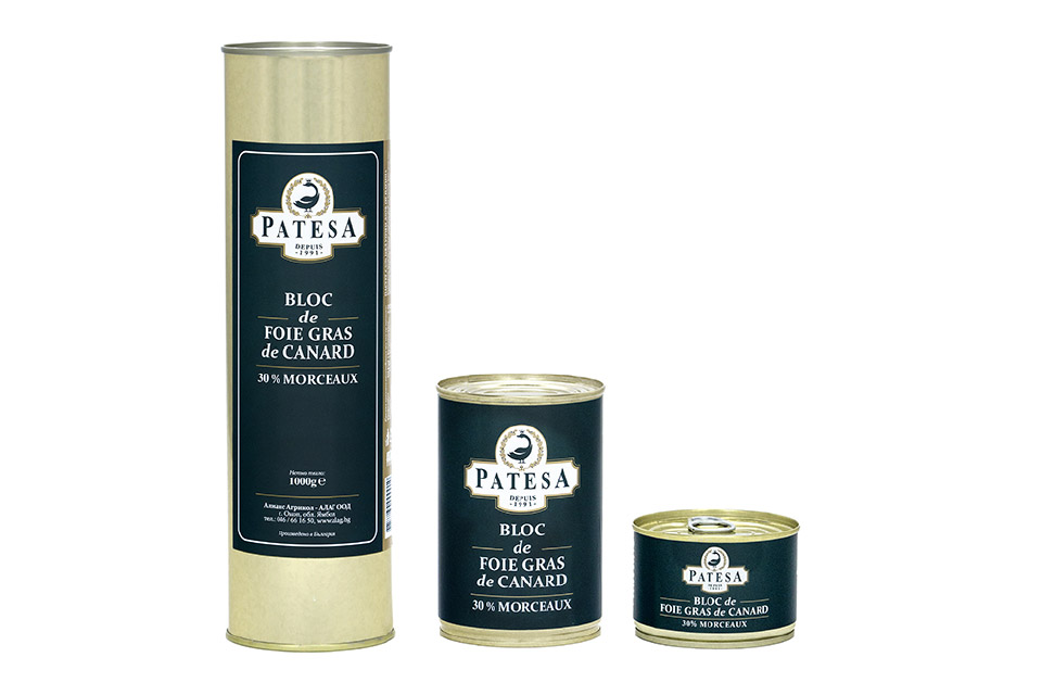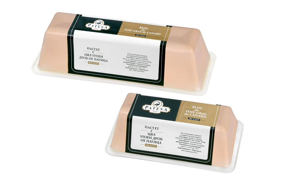 Терин от дроб от патица, овкусен с арманяк, бял пипер, захар, сол, от който 30% цял дроб от патица и 70% пастет от патица.